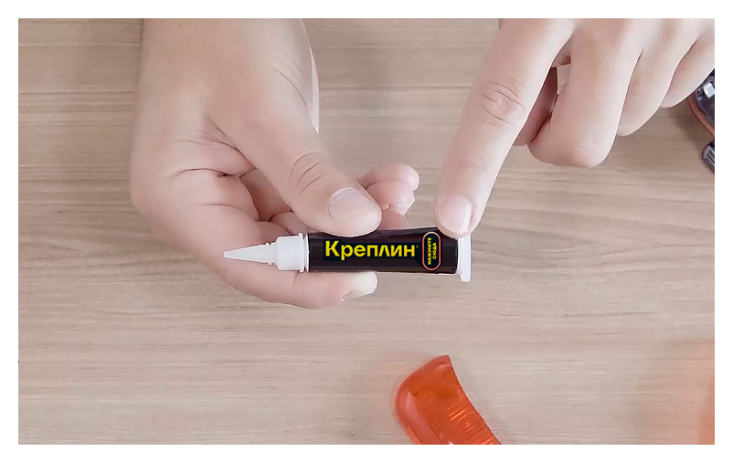Возьми крышечку-аппликатор и прикрути ее к тюбику до прорыва защитной мембраны. После чего выдави необходимое количество клея, нажимая на отмеченную на тюбике зону.